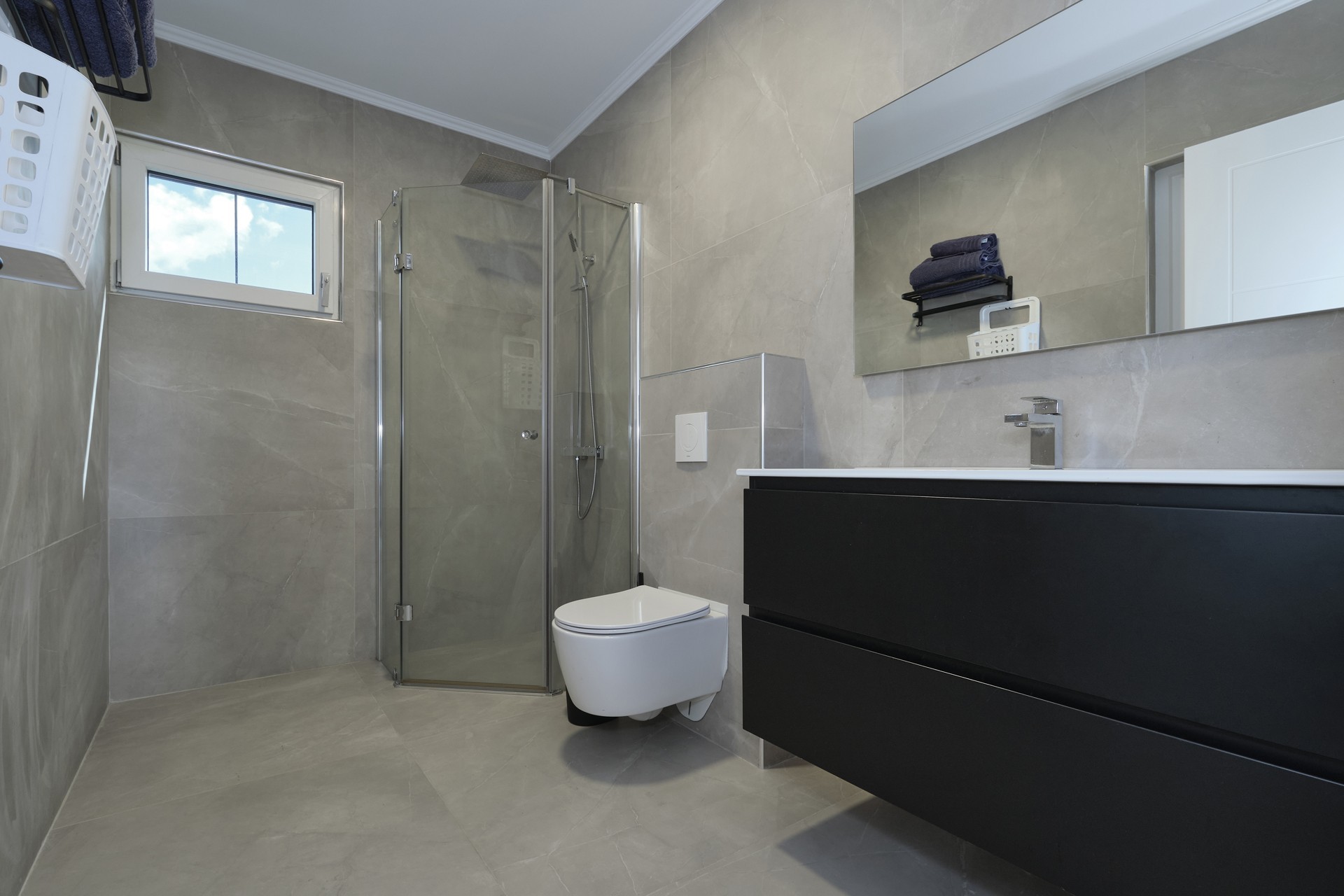 The upper-level apartment spans approximately 116 m² and is enhanced by a spacious 30 m² covered porch, ideal for outdoor relaxation. The residence features three bedrooms and two bathrooms, along with an open-concept living area that seamlessly connects the kitchen, dining, and living spaces. A conveniently located storage room adjacent to the kitchen adds to the apartment’s everyday functionality.