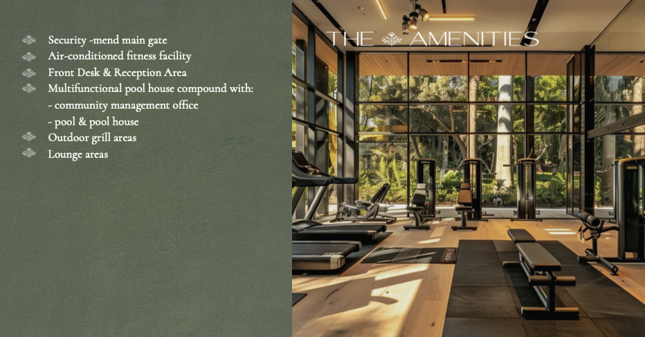 The community offers resort-style amenities including a pool, fitness center, reception area, landscaped walkways, outdoor lounges, and secure gated entry.
